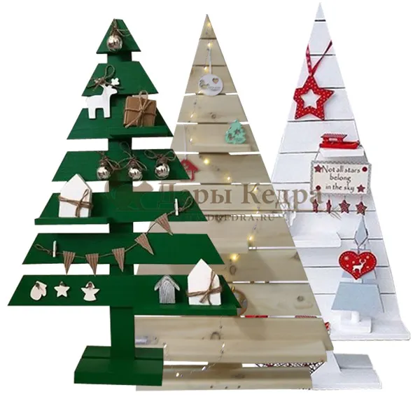 • Новогодняя деревянная ёлка с полочками Хотите удивить дорогого Вам человека в канун Нового года? Предлагаем вам большой выбор аксессуаров из кедра, которые не только запомнятся в качестве ценного подарка, но и вполне могут украсить праздничный стол, разнообразить любой офис, стать привлекательным атрибутом в фотостудии. Рекомендуем ёлку из кедра для домашнего творчества с детьми. Создайте неповторимую, единственную в своём роде новогоднюю красавицу, играя с ребёнком. Это внимание и поделку он запомнит навсегда...Уж, поверьте! Деревянная елочка, по Вашему желанию, может быть покрашена в зеленый, белый, серый, фиолетовый цвета или покрыта бесцветным маслом, воском, лаком. Дополните новогоднюю красавицу гирляндой, шарами, бантами, и она засверкает по-новому. Цена ёлки указана без учета украшений. Украшения, представленные на фото, могут отличаться от имеющихся, необходимо заранее согласовывать перечень игрушек с менеджером отдела продаж. При заказе украшений цена увеличивается на 50%.